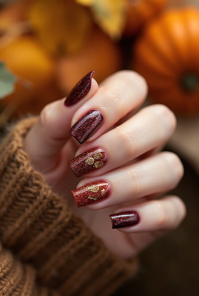 Glitter is a game-changer when it comes to nail art, especially in fall. Whether it’s gold flecks on deep burgundy or copper sparkles on warm brown, glitter elevates any simple fall nail design.