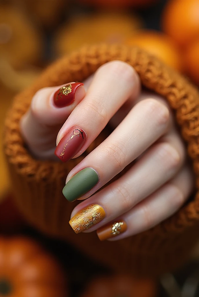 Matte nails are effortlessly stylish and perfect for autumn. Shades like burnt orange, deep green, and maroon look stunning with a matte finish. Add simple line art, dots, or metallic accents to make them even more eye-catching.